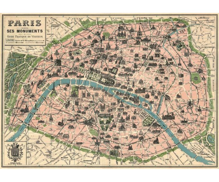 "Vintage Paris Map Monuments Poster 20" x 28" by Cavallini & Co - Perfect Wall Art for Paris Lovers"